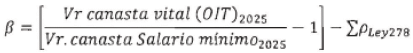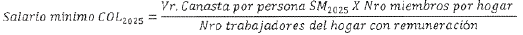 Paso 2. Cálculo del valor de la canasta según el salario mínimo mensual 2025, aplicando la fórmula de salario vital. El salario vital para el salario mínimo se calcula con la siguiente ecuación: