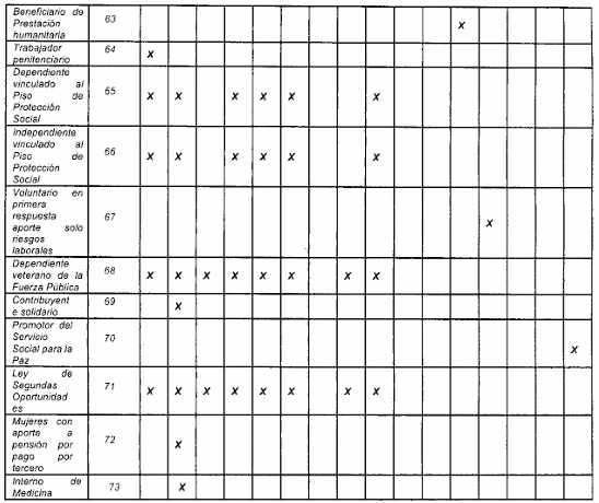 | 67 | Voluntario en primera respuesta aporte solo al Sistema de Riesgos Laborales. |