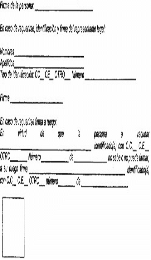 Entiendo que la suscripción de este documento constituye una expresión autónoma de mi voluntad, y que NO tiene por objeto eximir de responsabilidad a las autoridades sanitarias o gubernamentales ni a las entidades que participaron en la aplicación de la vacuna contra el SARS-CoV-2/COVID-19 de brindar la atención en salud que sea necesaria por la aparición de posibles reacciones adversas no reportadas.