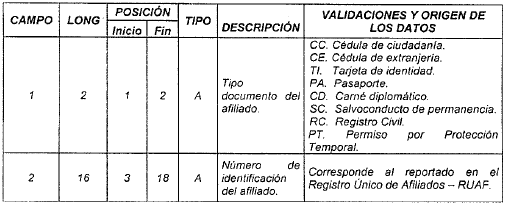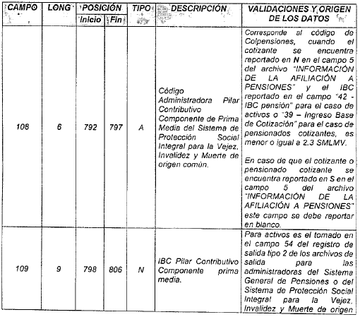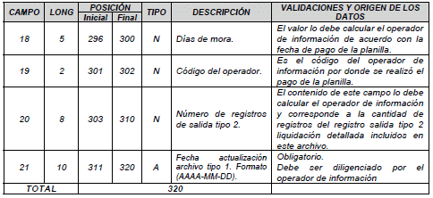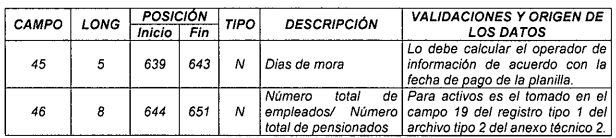 | 3 | 2 | 10 | 11 | N | Código del operador | Para activos es el tomado en el campo 28 del archivo tipo 1 del anexo técnico 2. Para pagadores de pensiones es el tomado en el campo 25 del archivo tipo 1 del anexo técnico 3. |