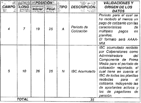 | 5 | 15 | 22 | 36 | N | Total a pagar a pensiones. | Para activos es el tomado en el campo 2 del registro tipo 12 del Anexo Técnico 2. Para pagadores de pensiones es el tomado en el campo 2 del registro tipo 7 del Anexo Técnico 3. |