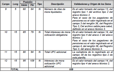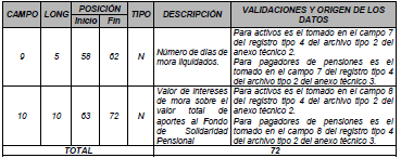 | 9 | 11 | 56 | 66 | N | Valor intereses de mora sobre el aporte. | Tomado en el campo 7 del registro tipo 9 del Anexo Técnico 2. |