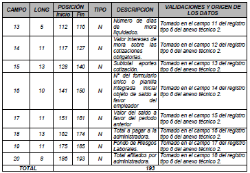 | 4 | 10 | 12 | 21 | N | Número de radicación o de la planilla integrada de liquidación de aportes. | Para activos es el tomado en el campo 17 del registro tipo 1 del archivo tipo 2 del anexo técnico 2. Para pagadores de pensiones es el tomado en el campo 12 del registro tipo 1 del archivo tipo 2 del anexo técnico 3. |