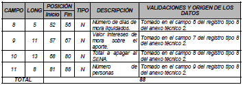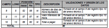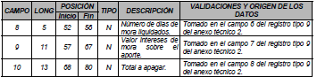 | 8 | 4 | 52 | 55 | N | Número de días de mora liquidados. | Tomado en el campo 6 del registro tipo 11 del Anexo Técnico 2. |
