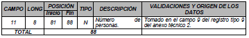 | 11 | 8 | 80 | 87 | N | Número de personas. | Tomado en el campo 9 del registro tipo 9 del Anexo Técnico 2. |